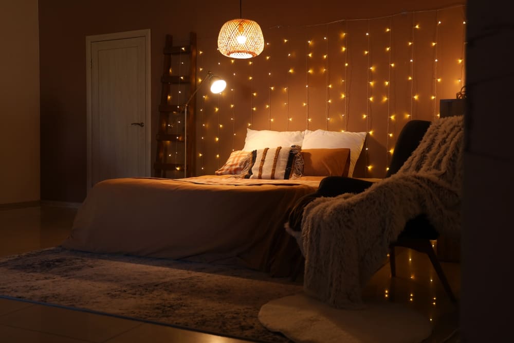 Trade one harsh overhead for three glow zones. Matching nightstand lamps for symmetry. A plug-in picture light above the headboard. A slender floor lamp near a lounge chair. Add plug-in dimmers to shape the mood. Hide cords with adhesive clips running behind furniture so surfaces stay clear.